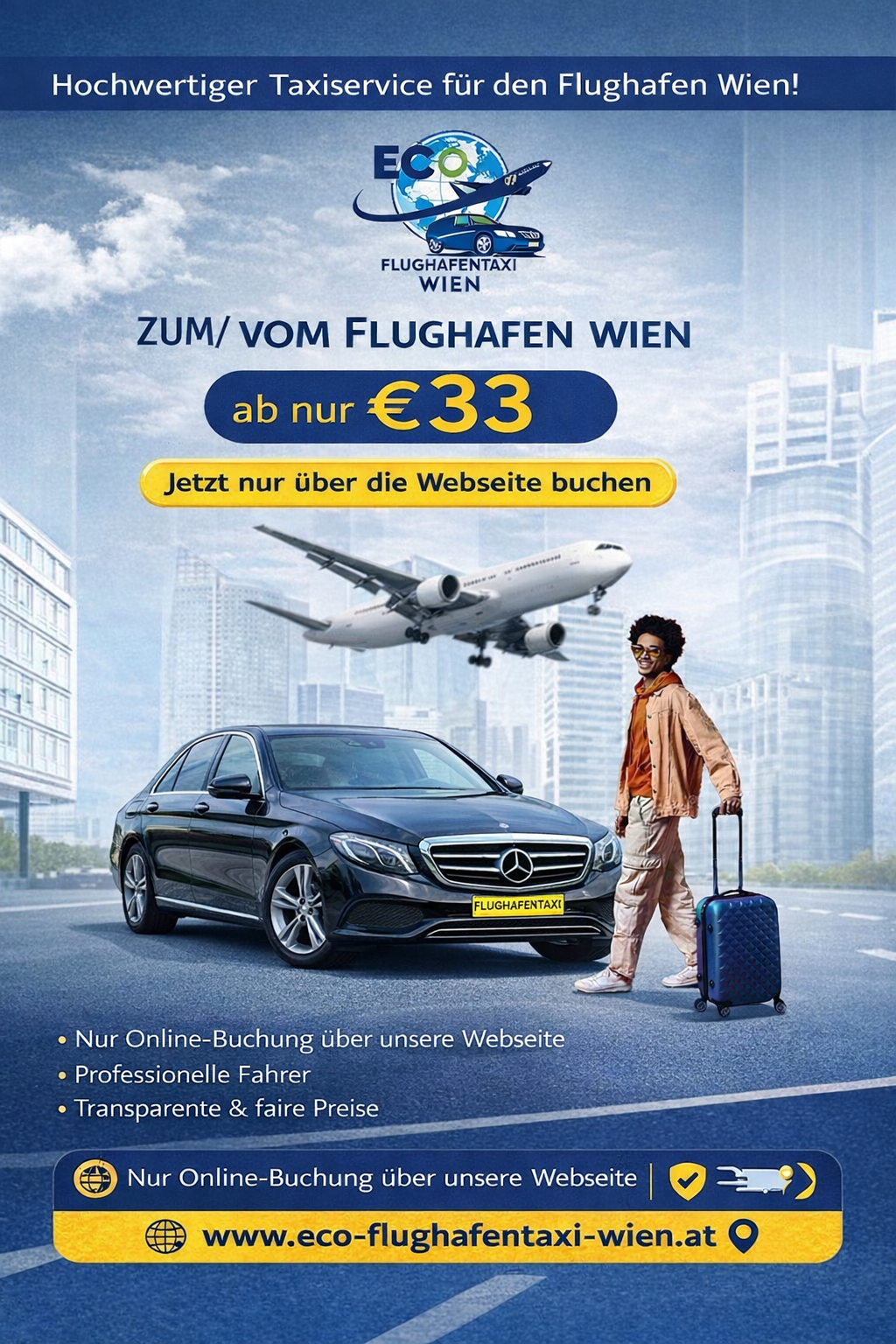 Eco Flughafentaxi Wien bietet zuverlässige und umweltfreundliche Flughafentransfers in Wien und ganz Österreich an zum Fixpreis ab nur €33. Ob Einzelperson, Familie oder Geschäftsreisender: komfortable Fahrzeuge wie Limousinen, Kombis oder Vans stehen jederzeit bereit. Kindersitze sind kostenlos, und bei Flugverspätung entstehen keine Zusatzkosten. Online-Buchung ist einfach und schnell, mit garantiert pünktlicher Abholung und sicherer Fahrt direkt bis zum Flughafen Wien-Schwechat. Reisen Sie entspannt, bequem und ohne versteckte Gebühren mit Ihrem Eco Flughafentaxi Wien.